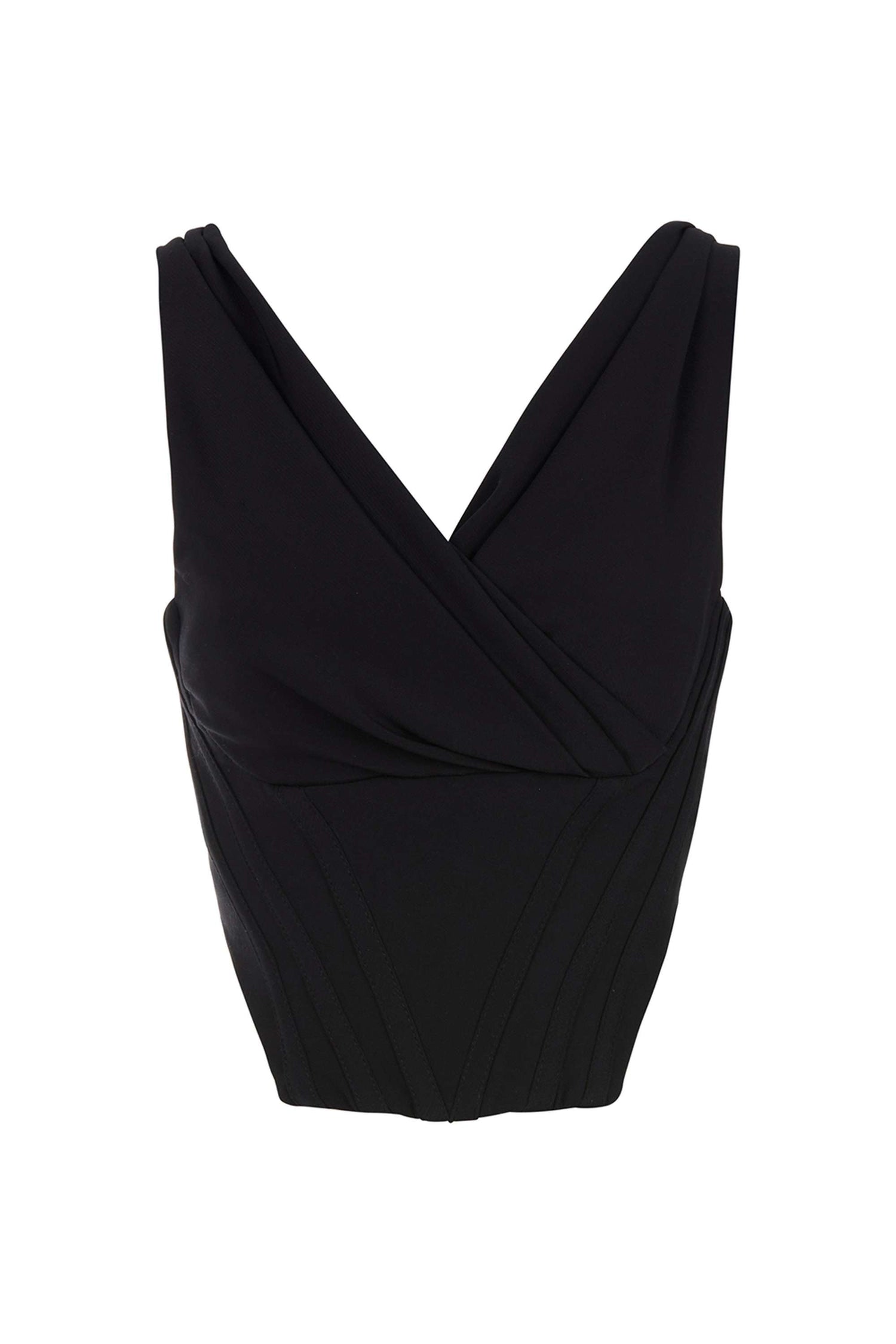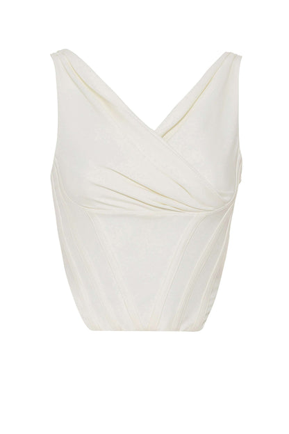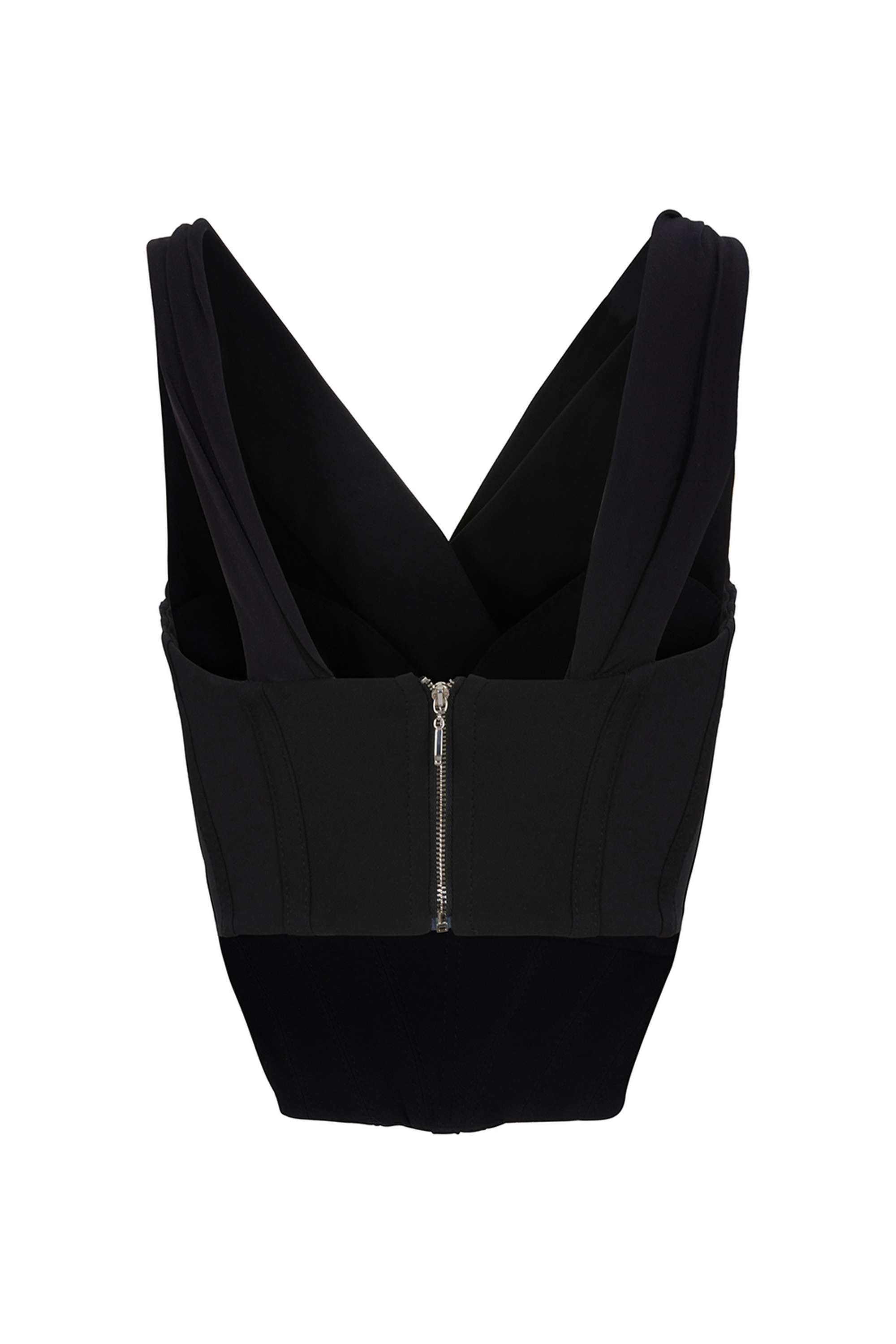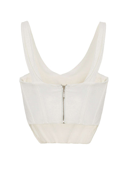Back zipper closure, crisscross flowy neckline bodice crop top