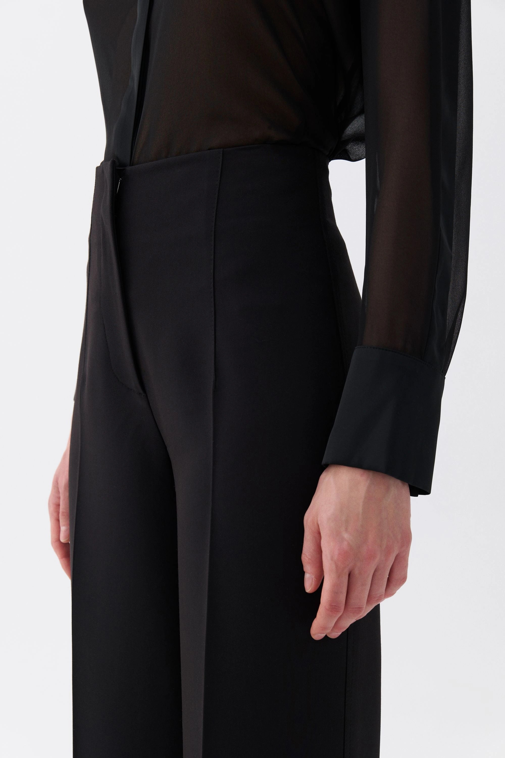 High waist, wide leg palazzo pants with zipper and hook closure.