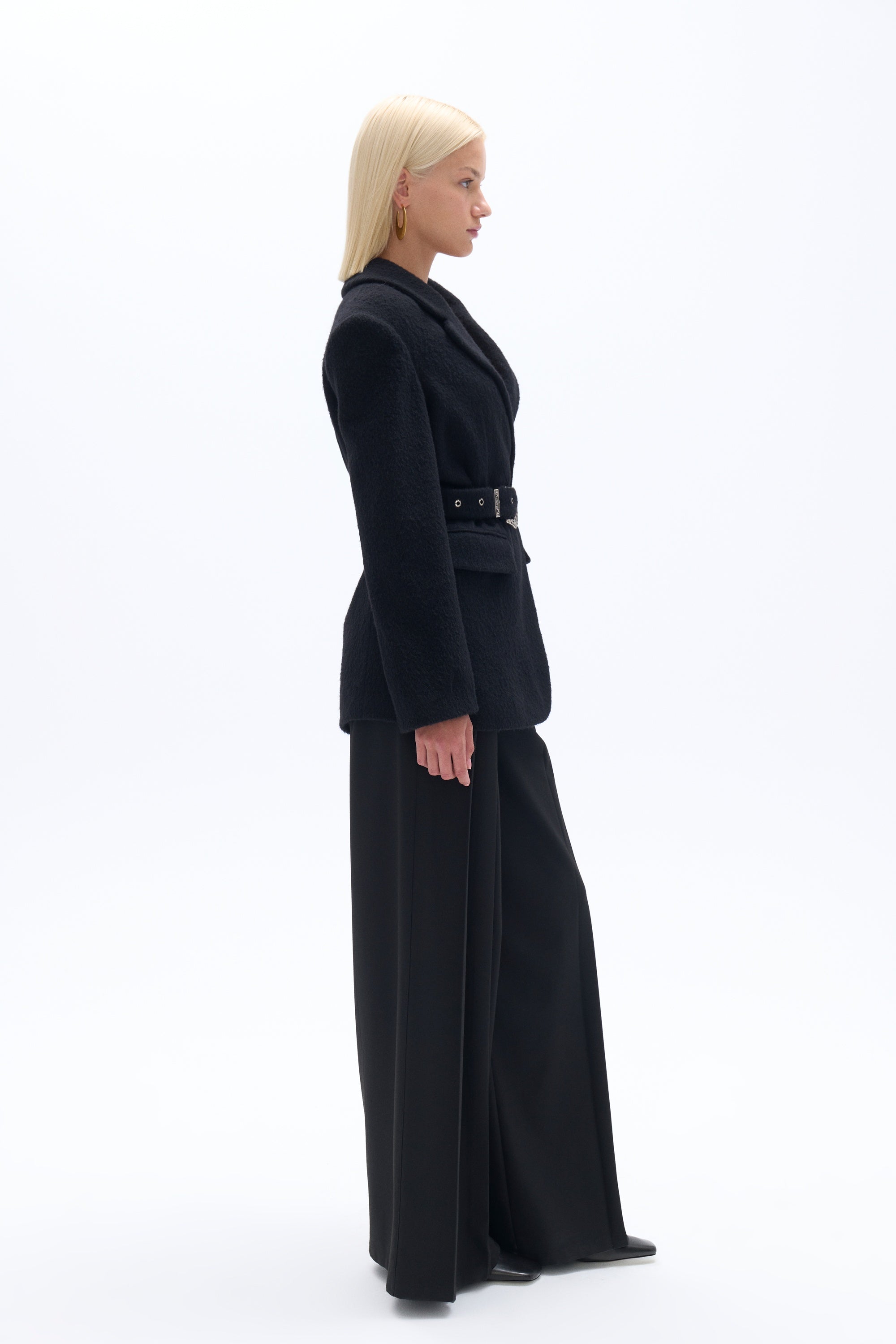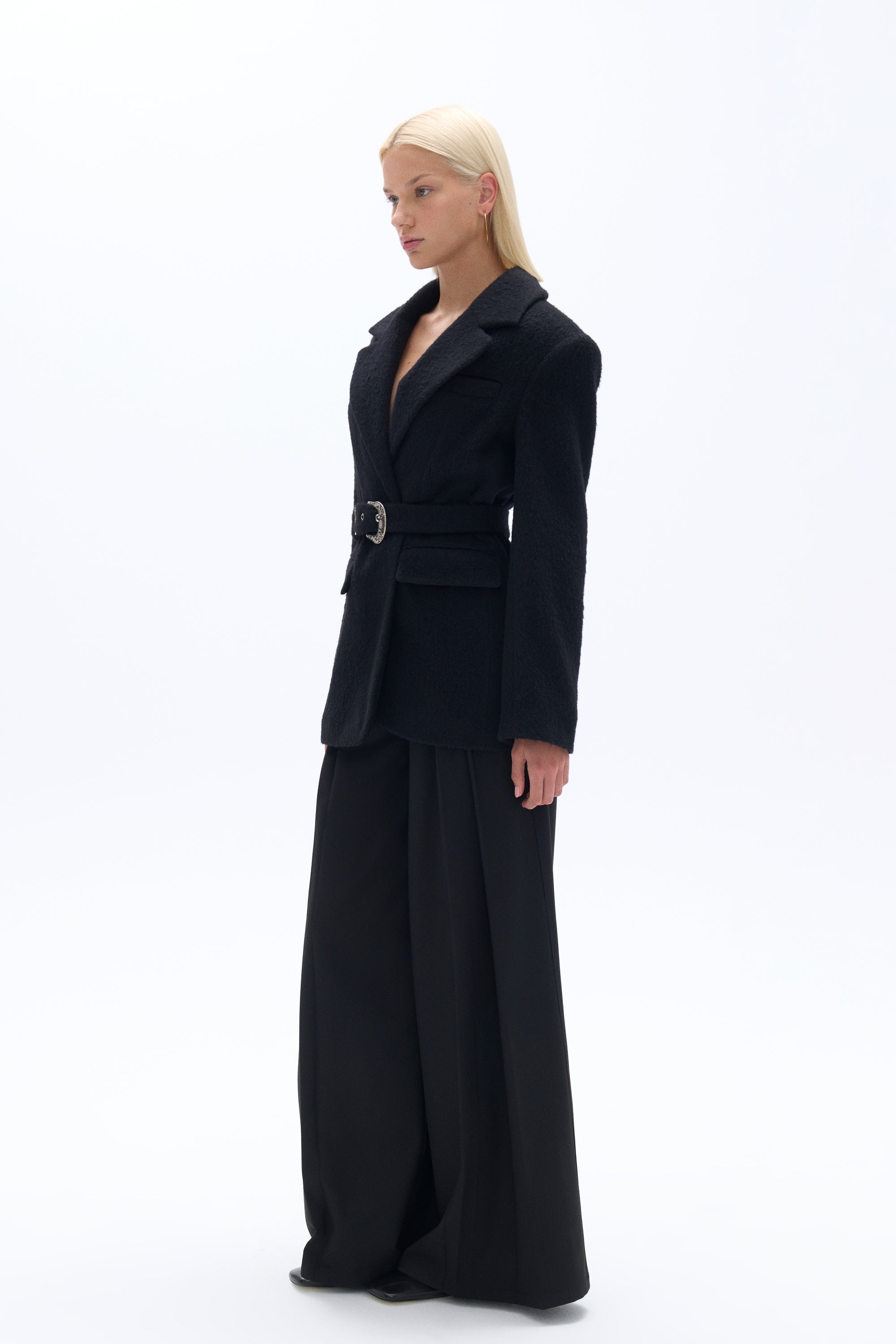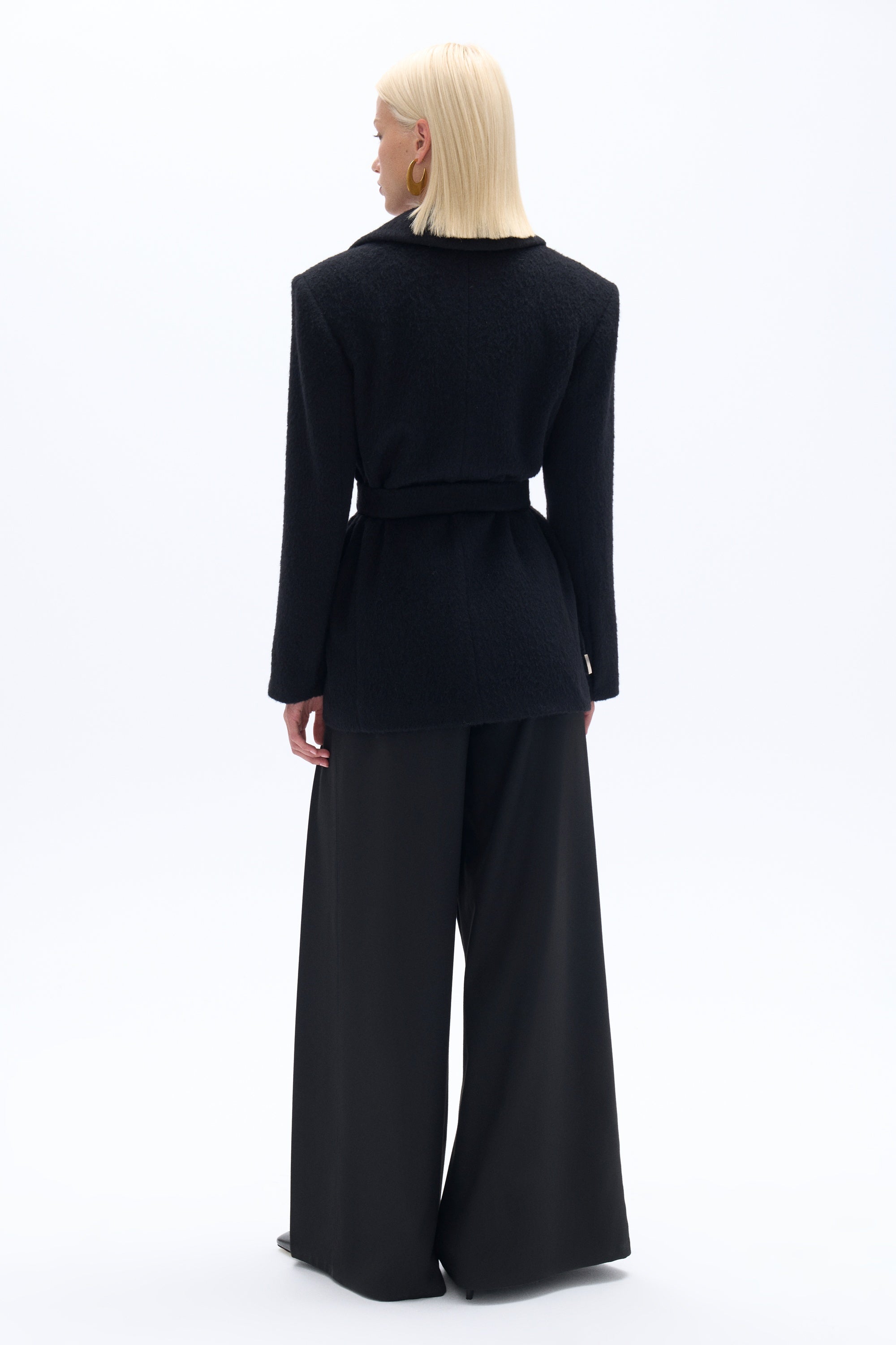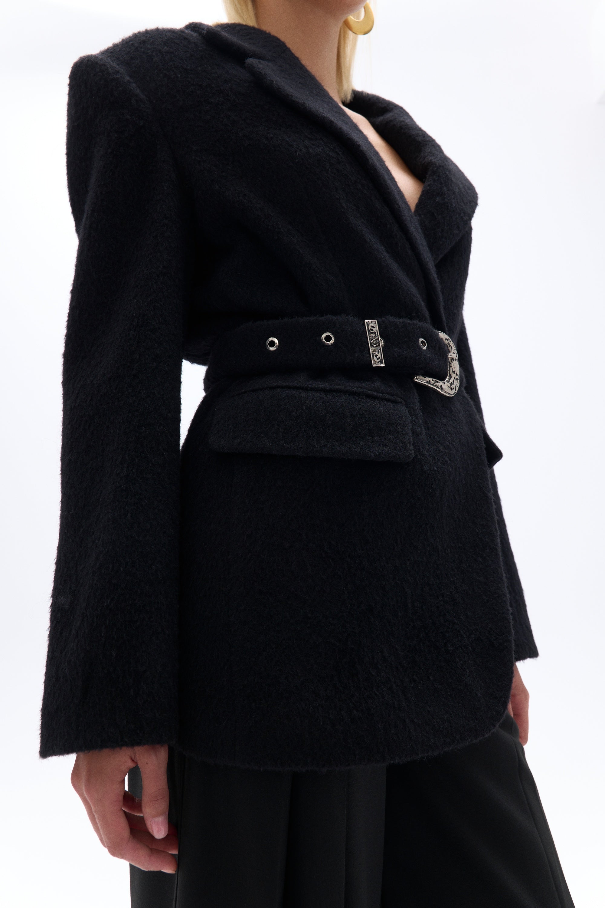 Navigate your day with comfort in this sleek jacket adorned with belt detail. It features a regular fit, full mould, lined and double-breasted closure. a padded shoulder jacket. The self-fabric belt detail offers a seamless transition from day to night.