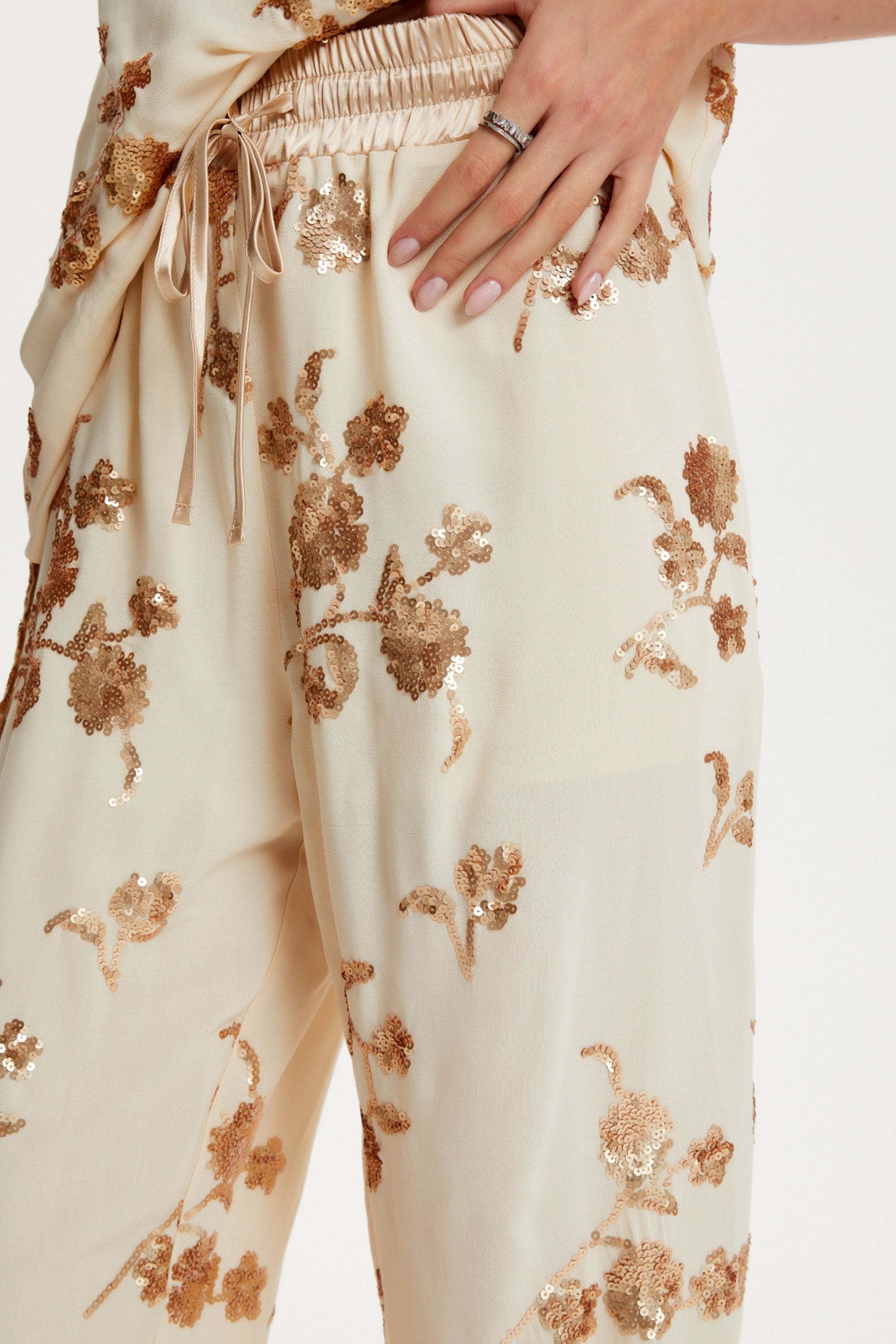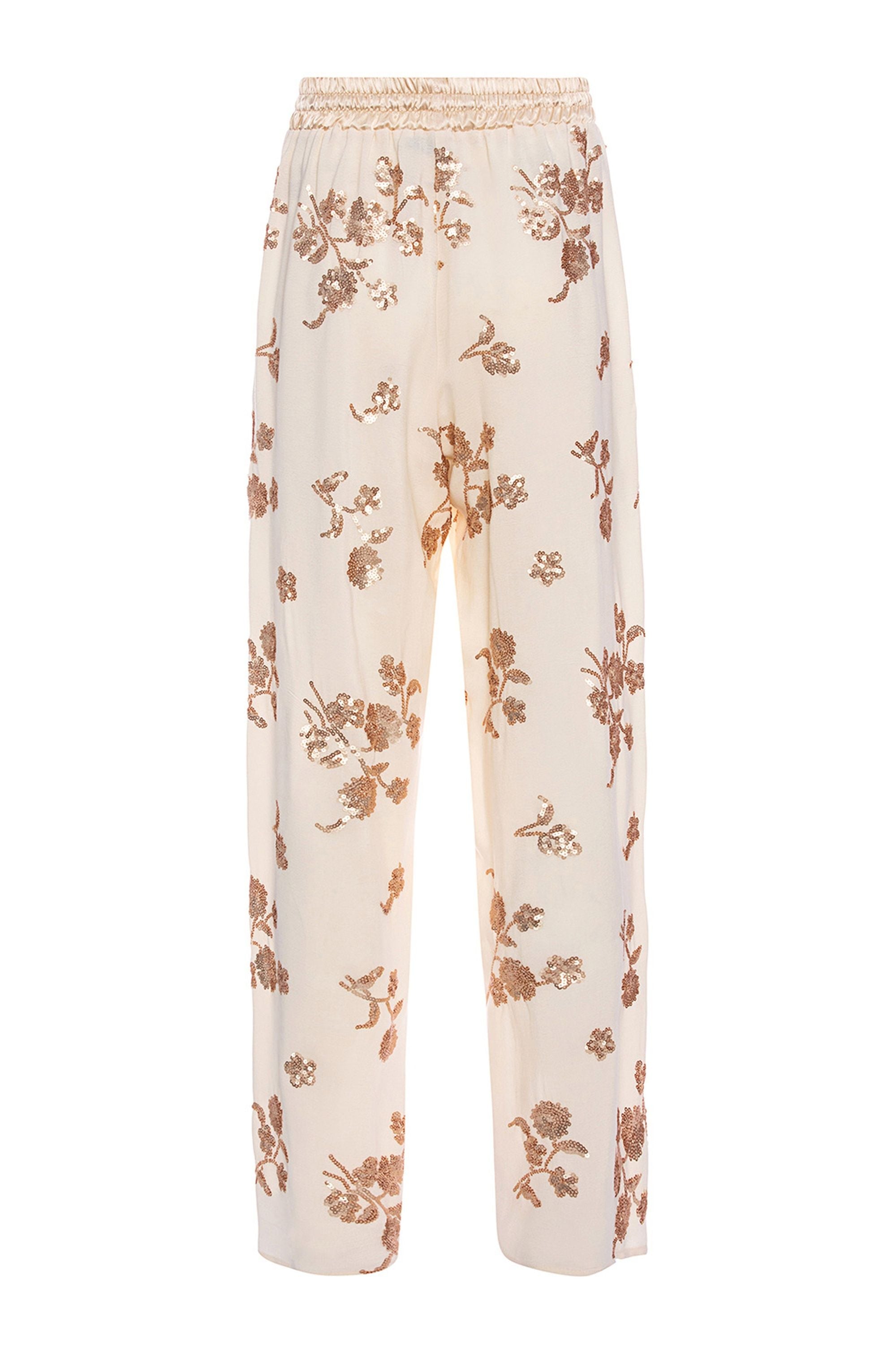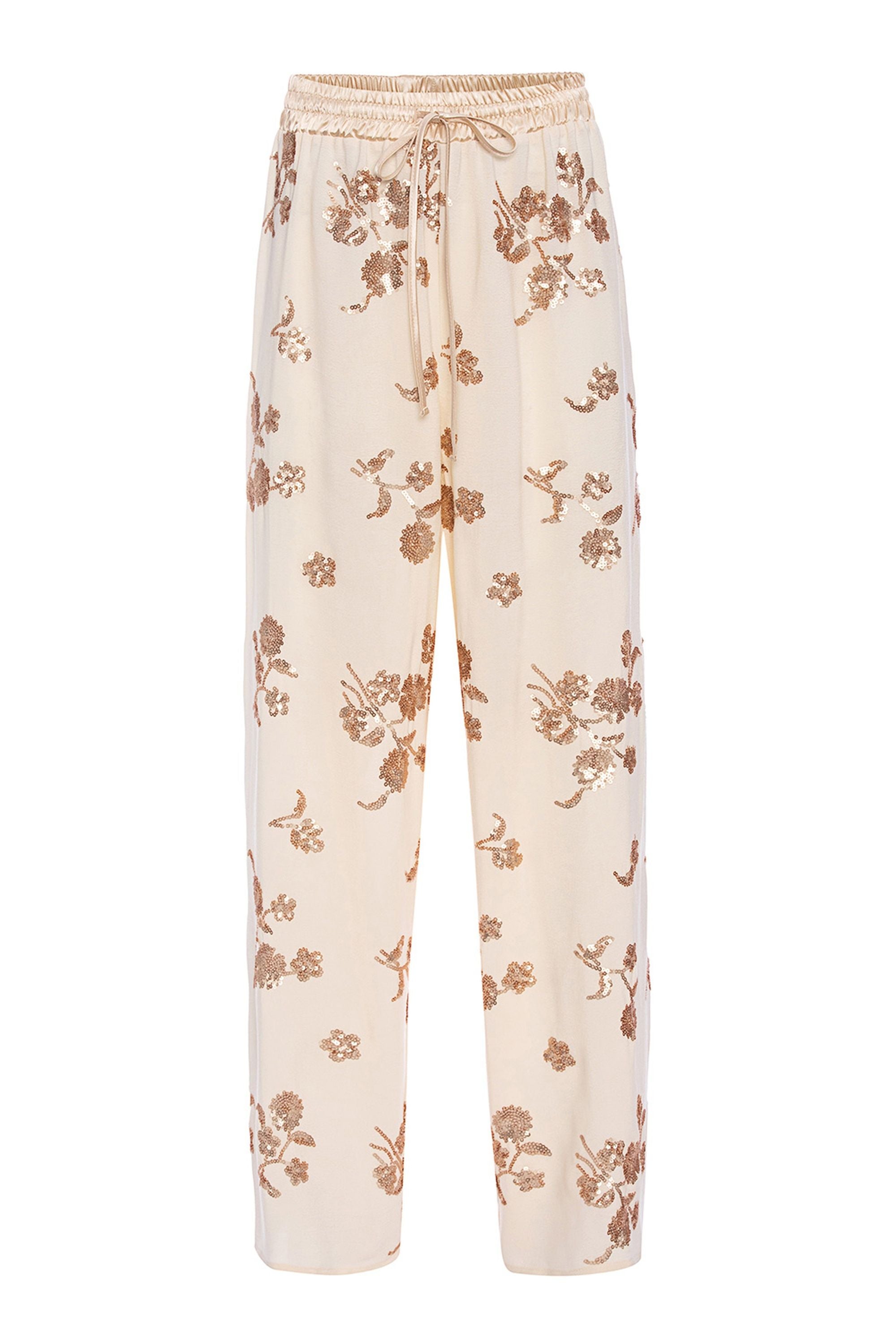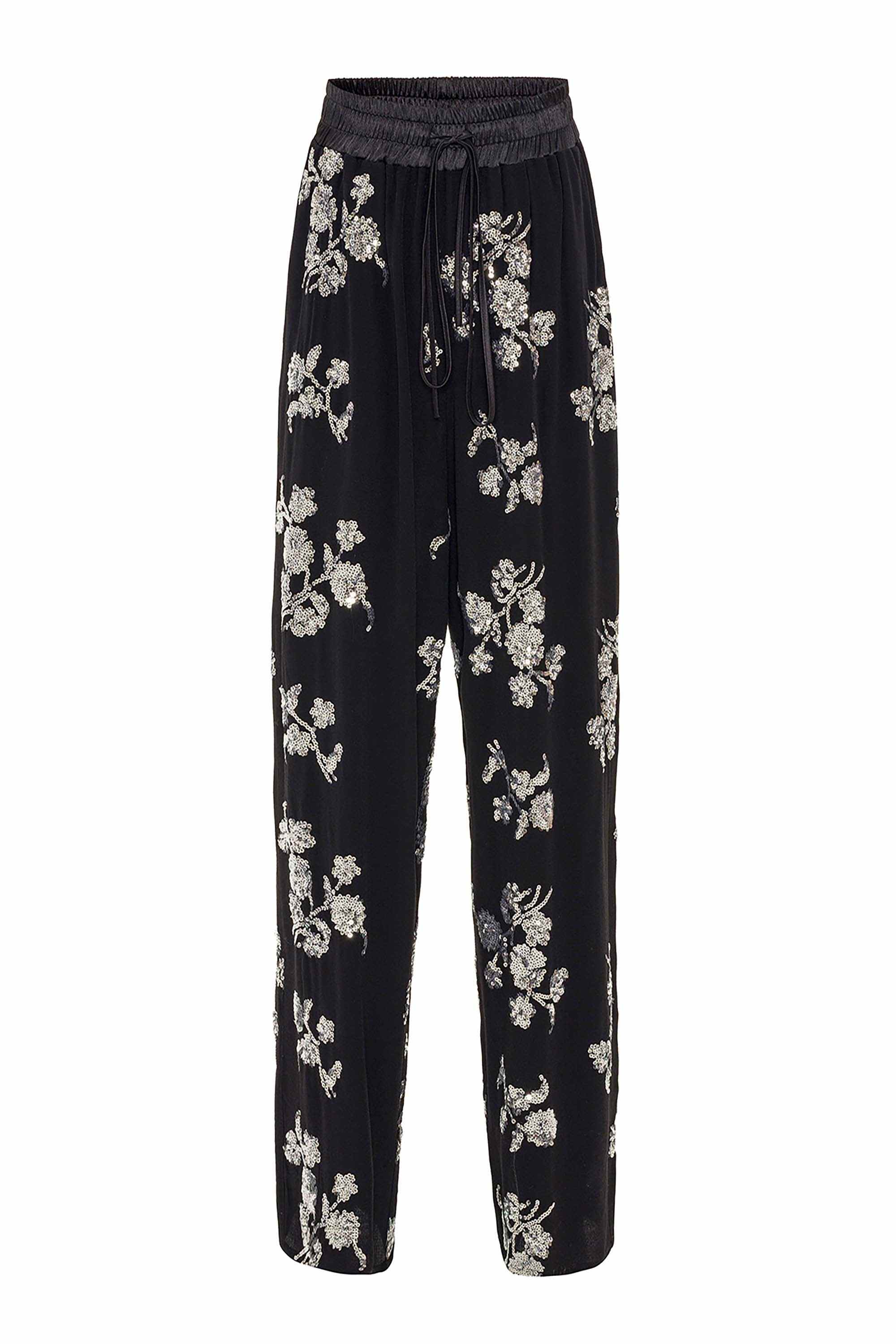 High-waisted wide-leg pants with adjustable waistband, and embroidery detail.